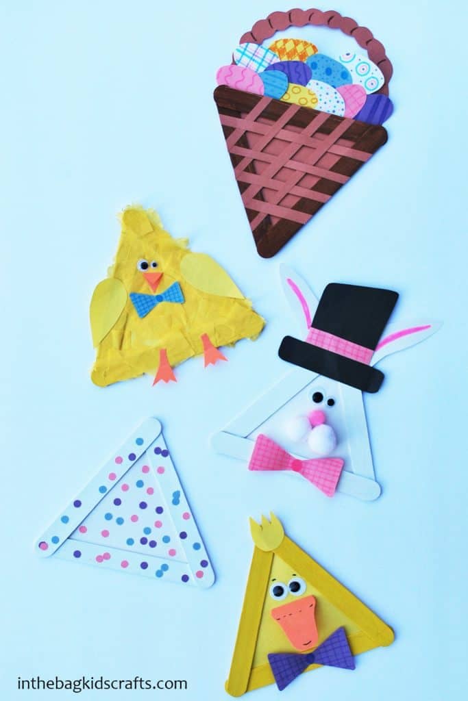 These Easter Crafts Ideas are a fun collection of some of our favorite simple Easter crafts. Each one starts with a basic triangle popsicle stick frame and goes from there. I know, triangle shaped eggs are unorthodox, but they turned out so cute. Plus they are a easy for little ones to make and leave room for imagination. Get the Easter crafts printable to make it even easier to create.