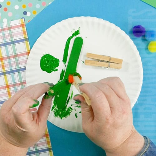 The above instructions call for using paint, but there’s a super fun way to skip the paint all together using my favorite craft supply…washi tape! For step 1, instead of getting out the paint, cover the popsicle stick and the 2 main sides of your clothespins with washi tape in green patterns. It can be all the same washi tape or mix it up. You’re going to love how it turns out and how little mess is required.