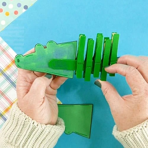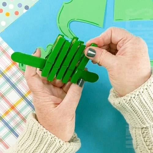 - Now that the paint has dried, clip the 5 clothespins side by side onto the popsicle stick. These act as the middle section of your alligator.